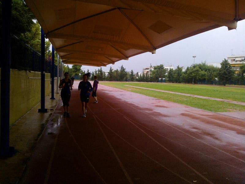 Σήμερα το πρωί η προπόνηση έγινε με βροχή. Για δύο περίπου ώρες έβρεχε ασταμάτητα και όμως η προπόνηση δεν σταμάτησε.